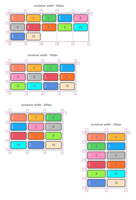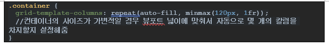12.4.5. auto-fill, auto-fit – 행/열의 개수를 그리드 컨테이너 및 행/열 크기에 맞게 자동으로 조정한다. repeat() 함수와 같이 사용되며 행/열 아이템 개수가 명확할 필요가 없거나 명확하지 않을경우 유용하게 사용됨(반응형 그리드!!) auto-fill 과 auto-fit은 간단한 차이점을 제외하면 동일하게 작용된다.