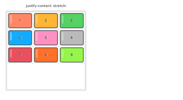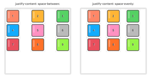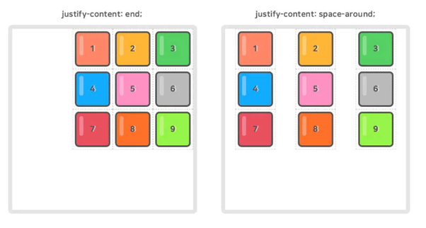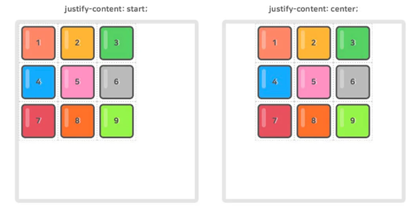 12.1.9. justify-content – 그리드 컨텐츠의 수평축을 정렬한다. 그리드 item의 가로너비가 그리드 container보다 작아야 한다.