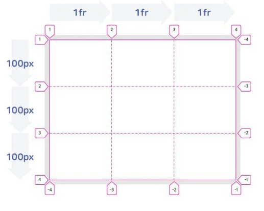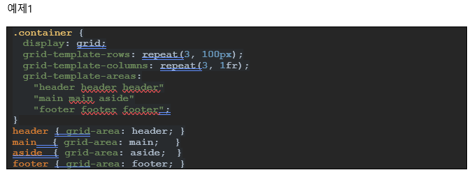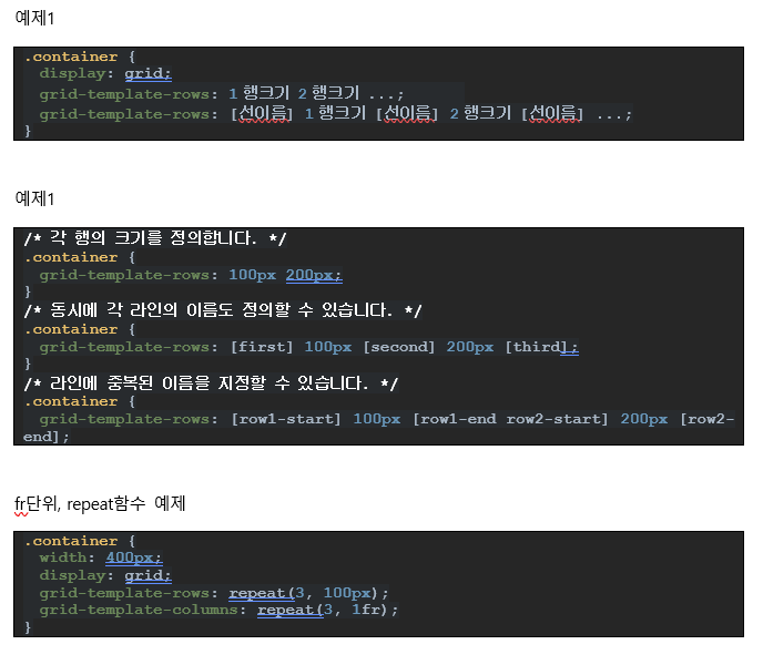 12.1.1. grid-template-rows – 맹시적 행의 크기를 정의,동시에 라인 이름도 정의할 수 있음. fr (fraction, 공간비율)단위를 사용할 수 있다. repeat()함수를 사용할 수 있다.