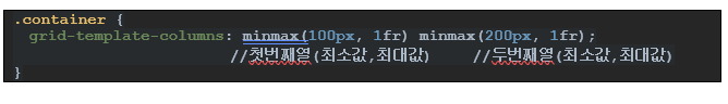 12.3.2. minmax() 함수 – 행/열의 최소,최대크기를 정의한다. 첫번째인자는 최소값이고 두번째 인자는 최대값이다. grid-template-rows, grid-template-columns, grid-auto-rows, grid-auto-columns에서 사용된다.