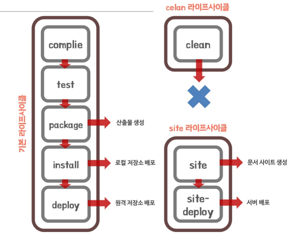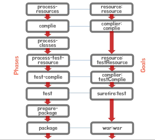 Maven에는 미리 정의된 빌드 순서가 있고 이를 라이프 사이클이라고 부른다. 라이프 사이클의 각 단계는 phase라고 하며 각 phase들은 의존관계이다. 즉, 한phase가 진행되려면 이전의 phase가 모두 수행된 상태여야 한다. Maven에서 제공되는 모든 기능은 플러그인 기반으로 동작한다. phase도 플러그인과 연결되어있다. 플러그인 안에서 실행할 수 있는 각각의 작업을 골이라고 하며 한 개의 phase는 한 개의 골과 연결된다.